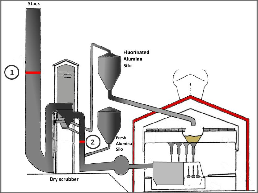 A dry scrubber is typically used to remove HF from the off gas by mixing it with fresh (primary) Alumina. The gaseous HF bonds to the primary Alumina and the HF enriched Alumina is gathered in a bag filter system and transported to the process to be used in the electrolysis process.