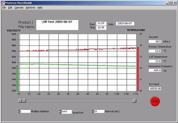 The ViscoView® data collection software connects via Modbus protocol and RS232 or RS485 serial interface to the ViscoScope transmitter series. ViscoView® works with a PC under Windows® 98 / NT / 2000 and XP.
